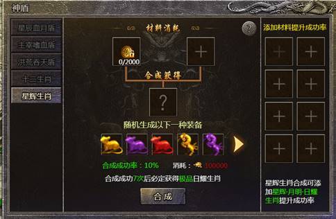 2、星辉生肖合成分3阶,星辉-月明-日耀,每次合成需要消耗星辉生肖,有概率合成极品生肖,可添加其他生肖提高合成成功率