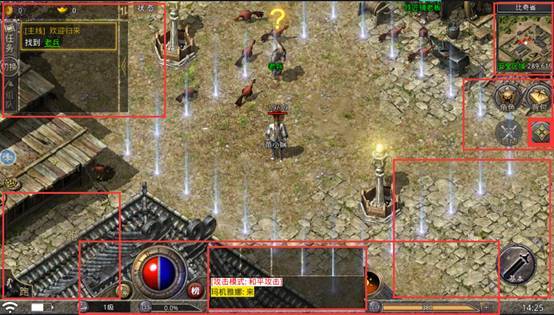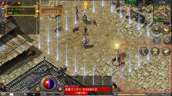 3. 角色信息区:包括角色装备,背包物品以及自动战斗按钮,还有一个切换按钮控制着技能区和玩法入口的显示
