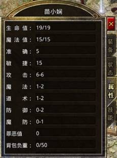 属性包括:生命值,魔法值,准确(物理攻击的命中概率),敏捷(闪避收到的物理攻击),攻击(战士的核心属性,决定物理伤害),魔法(法师的核心属性,决定物理伤害),道术(道士的核心属性,决定道术伤害),防御(抵抗受到的物理伤害),魔防(抵抗受到的魔法伤害),罪恶值,负重,魔法躲避(闪避收到的魔法攻击),增加伤害(增加造成的伤害)