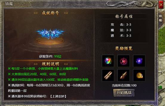 6、镇魔塔共有100层,每周一0点重置,每周日23点30分之后无法进入。通关99层将获得称号【上清玄妙】