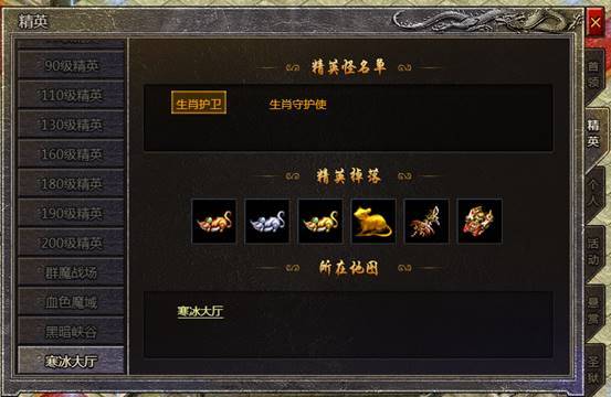 3、寒冰大厅的首领为生肖守护使和两个生肖护卫,击败他们有概率掉落生肖装备,击败生肖守护使更有概率掉落高阶生肖装备