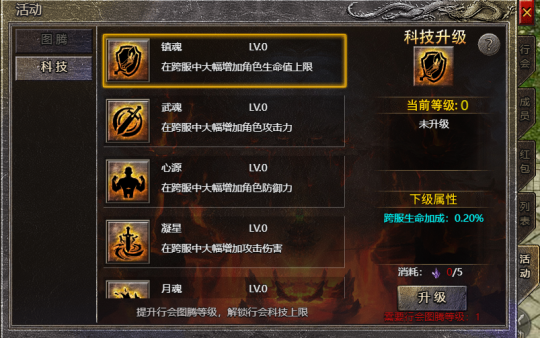 2、消耗科技碎片,升级行会科技等级,可获得对应的跨服属性加成